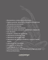 MANIFIESTO En movicorpo® sabemos que el Yoga es un método que nos brinda herramientas para desarrollar autoconocimiento, concentración, propiocepción y disciplina física y mental. Nos interesa formar practicantes e instructores que sean capaces de observar y aplicar los principios del Yoga adaptándolos tanto a su propio cuerpo y estilo de vida, como al de sus alumnos y alumnas, dándole prioridad al proceso y al desarrollo de la inteligencia corporal. Hemos desarrollado esta certificación que te ayudará a profundizar en la filosofía del Yoga de manera teórica y práctica, además, te dará las herramientas necesarias para compartir esta práctica de manera consciente, respetuosa y profesional. Desliza las imágenes para conocer todos los detalles.